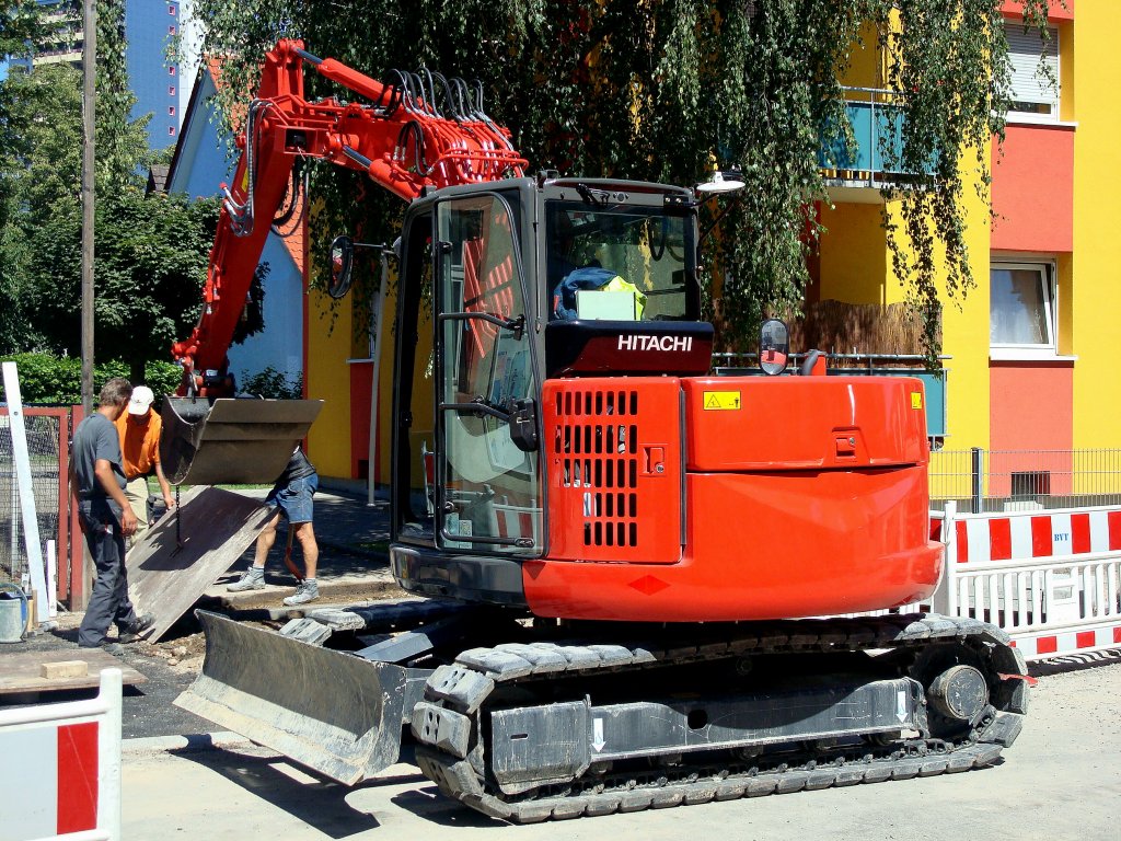 Hitachi, japanischer Mobilbagger bei Straßenbauarbeiten in Freiburg, Juli 2011