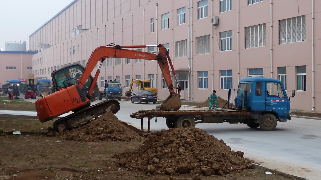 Bagger abladen auf chinesische Art, Teil 8: Mit der Schaufel auf dem LKW abstützen und weiter zurück fahren. (Shouguang, 29.7.11)