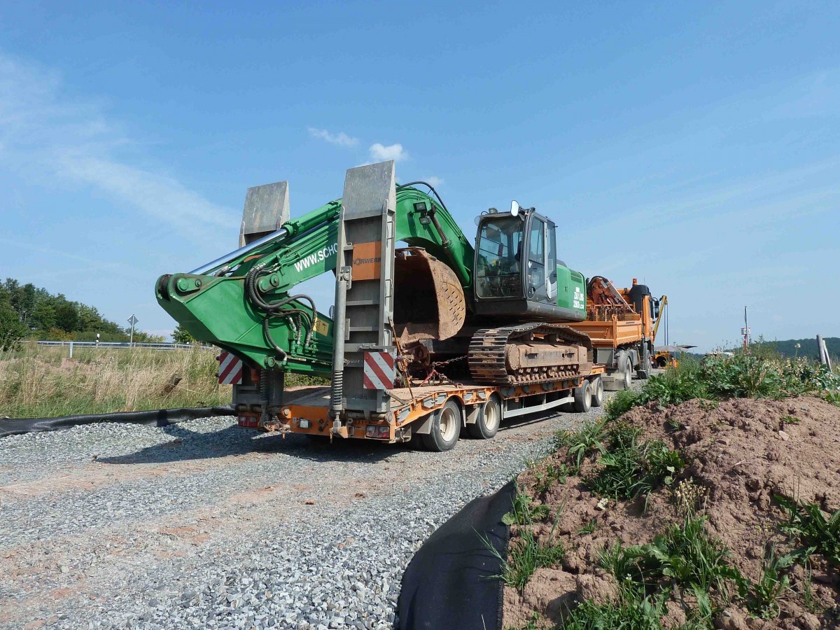 Hitachi Zaxis 280 steht fest verzurrt auf einem Tieflader der Firma "VORWERK", August 2013