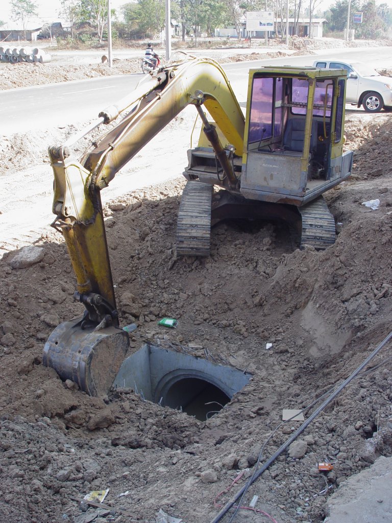 Ein kleiner Kettenbagger bei Schachtungsarbeiten in Lamplaimat im Nordosten Thailands am 04.02.2011. Keinerlei Herstellername erkennbar, nur an der Frontseite die Angabe "Dynamic" - ob das auf einen KOBELCO Bagger deutet?