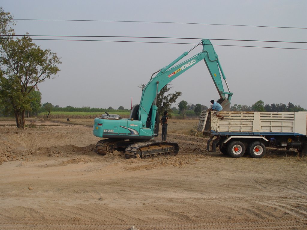 Dieser Kettenbagger SK200 Geospec von KOBELCO arbeitet am 07.02.2011 um 16.20 Uhr noch, aber der Augenblick des Feierabends ist nicht mehr fern. (Straßenbau bei Lamplaimat im Nordosten Thailands)