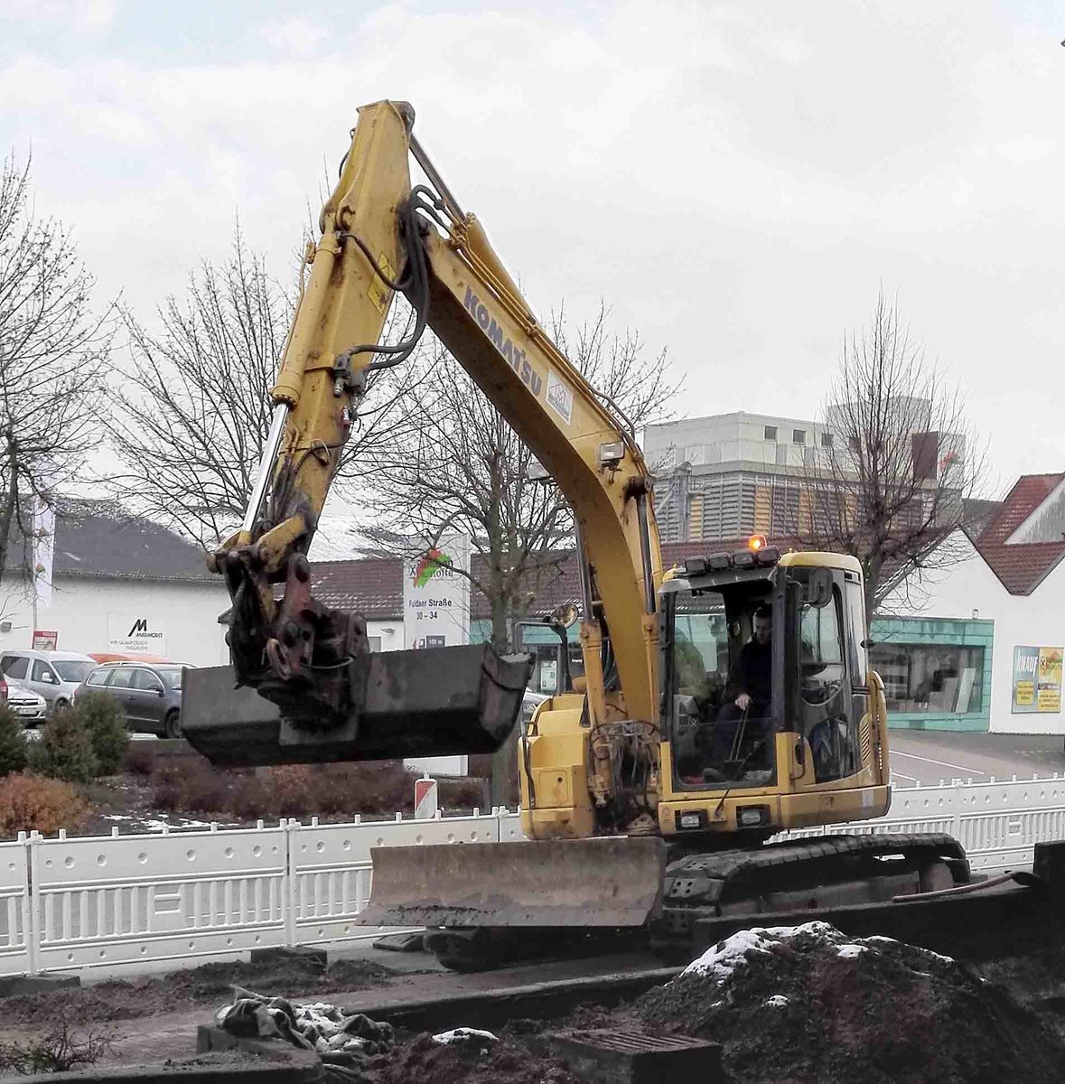 =Komatsu-Bagger eingesetzt auf einer Baustelle in Hünfeld im Dezember 2017