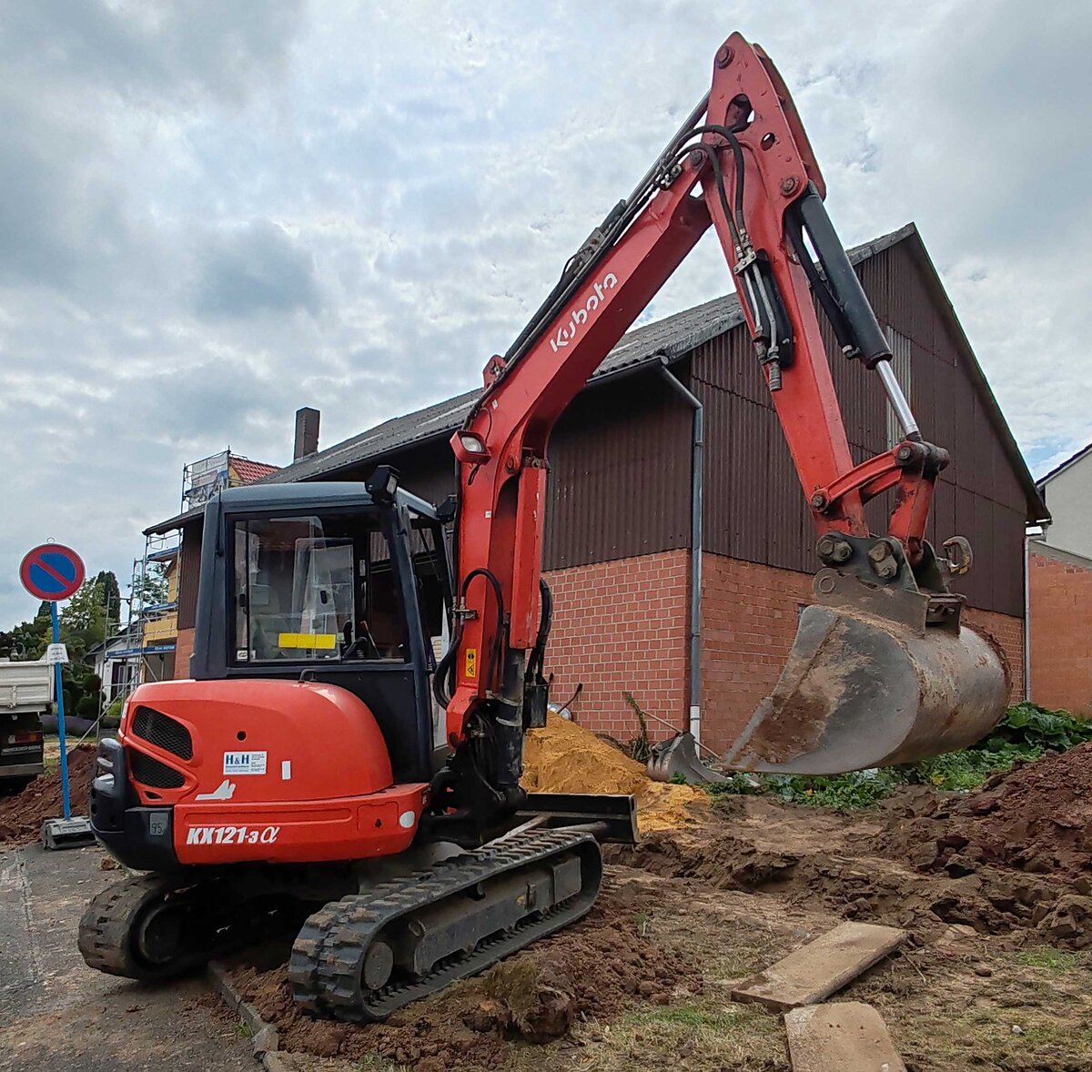 =Kubota KX 121 vom Bauunternehmen H & H steht im Juli 2025 auf einer Baustelle in Petersberg-Marbach