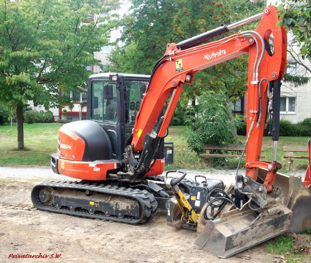 rechte Fahrzeugseite eines Kubota KX 057-4 (Bj. 2011, aufgenommen in Rostock am 20.8.2012