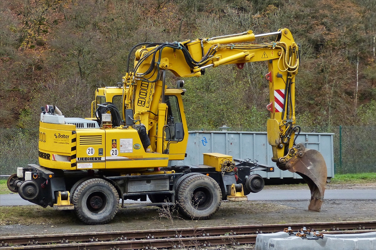 . Zweiwege Bagger Liebherr 900Litronic steht neben den Bahngleisen an einer Bahnbaustelle. 07.11.2015