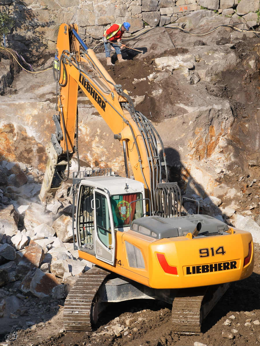 Ein Liebherr 914 zerkleinert mit seinem Vibrationshammer Gestein. (Porto, Januar 2017)