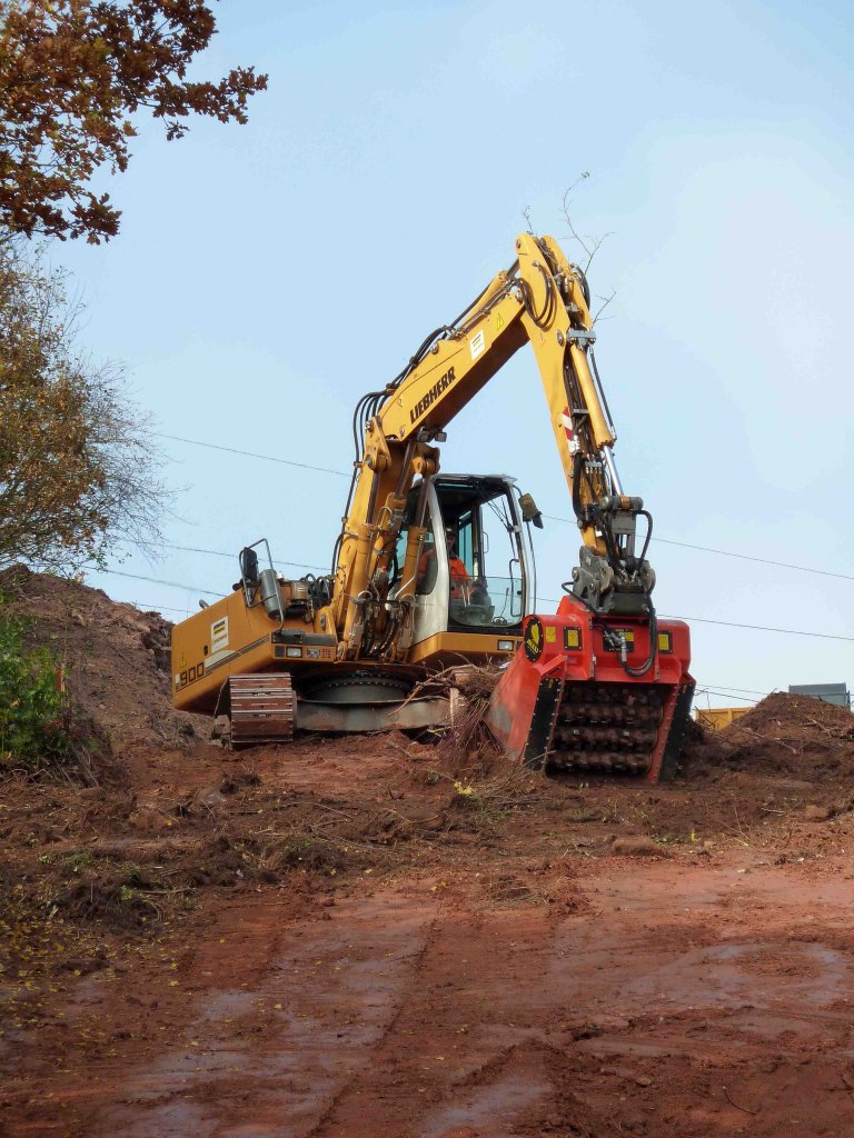 LIEBHERR 900 mit einer speziellen Schaufel mit eingebauter Fräseinrichtung. Das Erdreich wird von der Baggerschaufel aufgenommen und ........., Oktober 2012