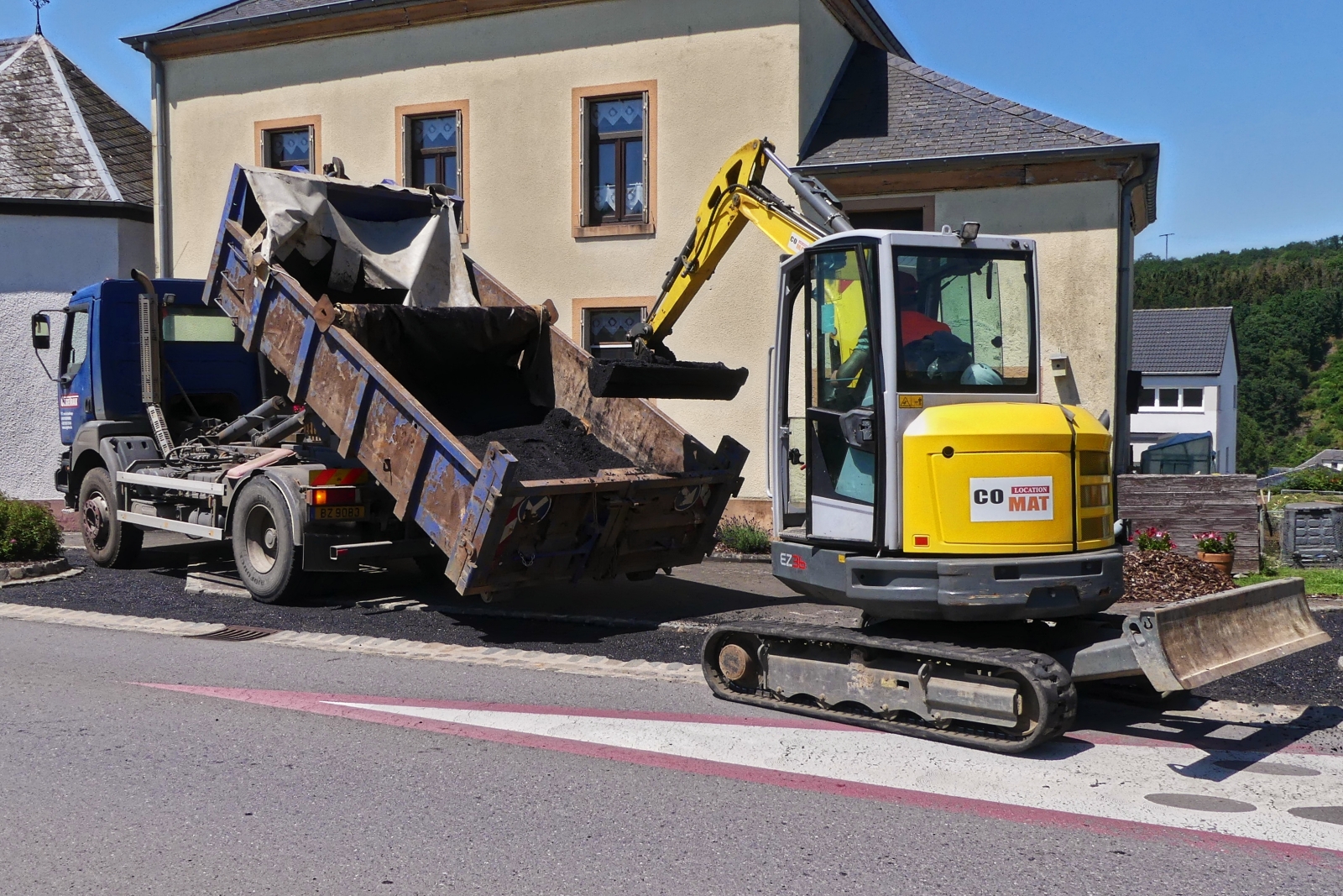 Wacker Neuson EZ 36, Raupenbagger beim Entnehmen vom Asphalt aus dem Kipper. 06.2024