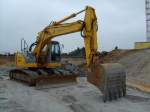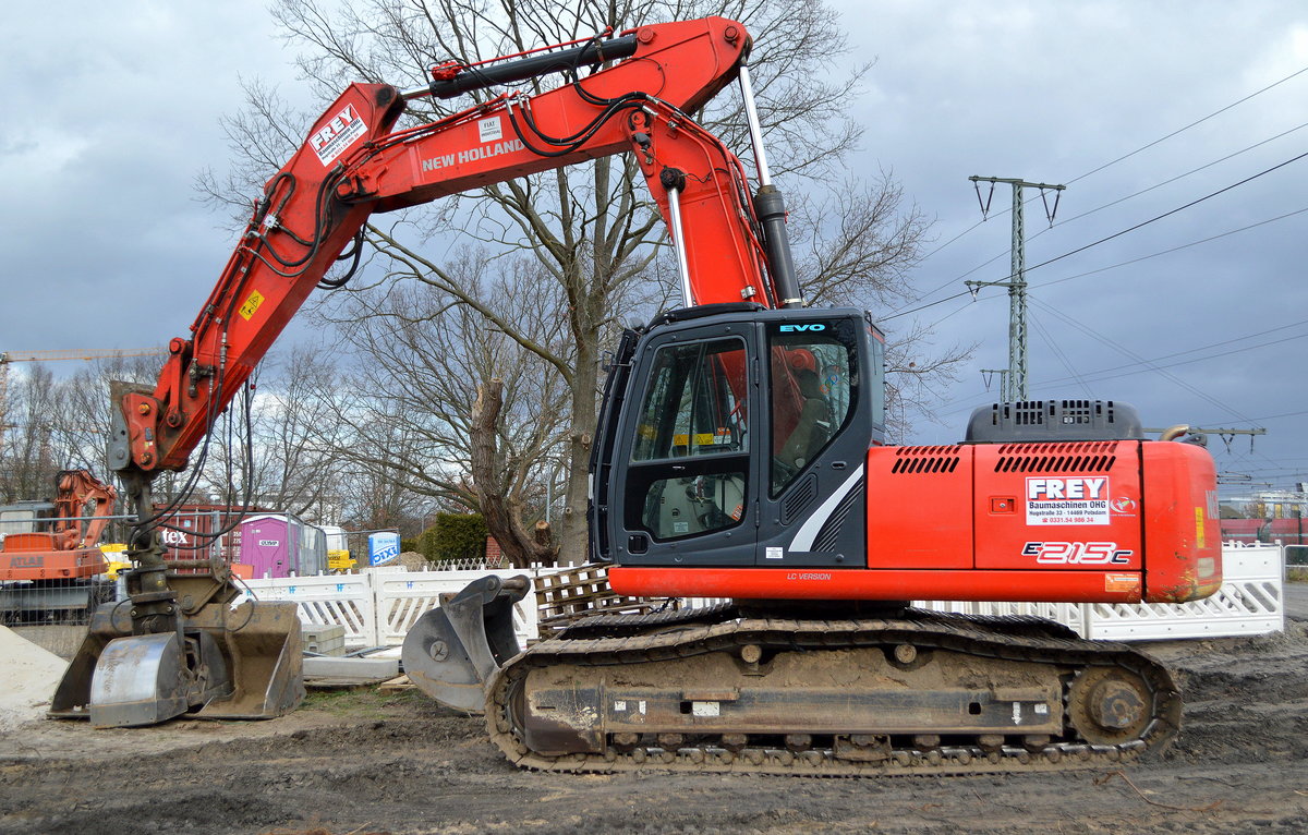 Ein NEW HOLLAND E215C LC Version Raupenbagger der Fa. FREY OHG (Mietbaumaschine) am 18.02.20 Baustelle Golm (Potsdam).