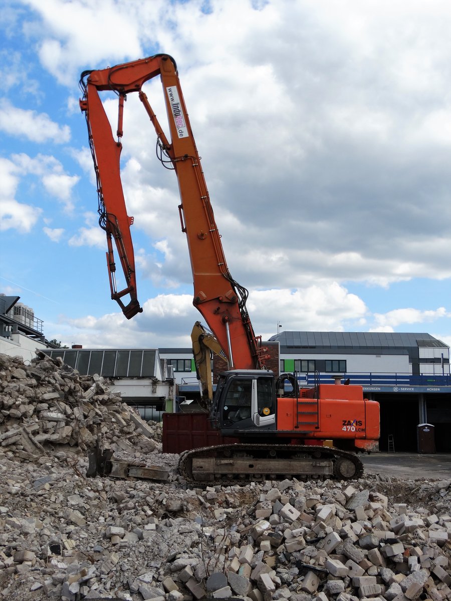 Zaxis Abriss Raupenbagger am 21.05.17 in Frankfurt am Main durch den Bauzaun fotografiert