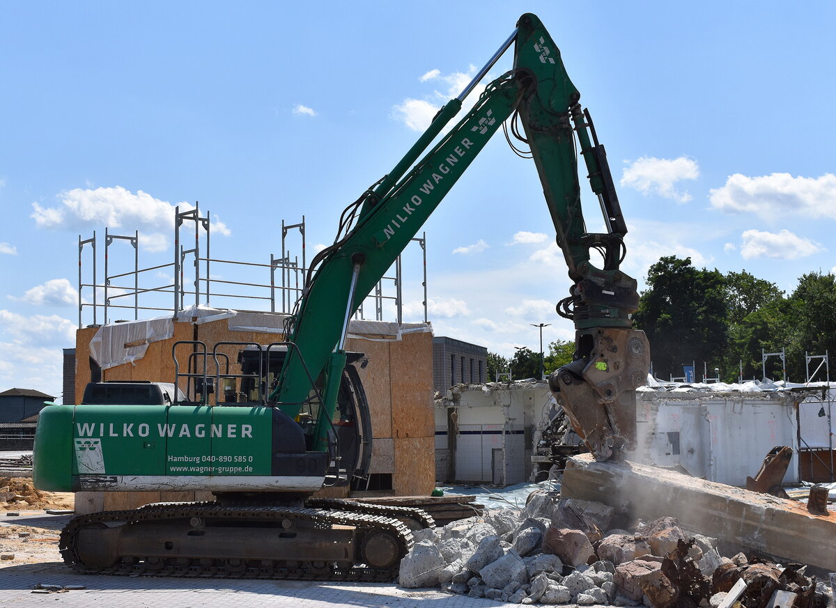 Die WIWA WILKO WAGNER GMBH aus Hamburg beim Abriss des Busbahnhofes Hamburg-Harburg direkt am Bahnhof, der ganze Neubau soll wohl vier Jahre in Anspruch nehmen, 15.07.24 Der Raupenbagger könnte ein CAT oder LIEBHERR Modell sein?