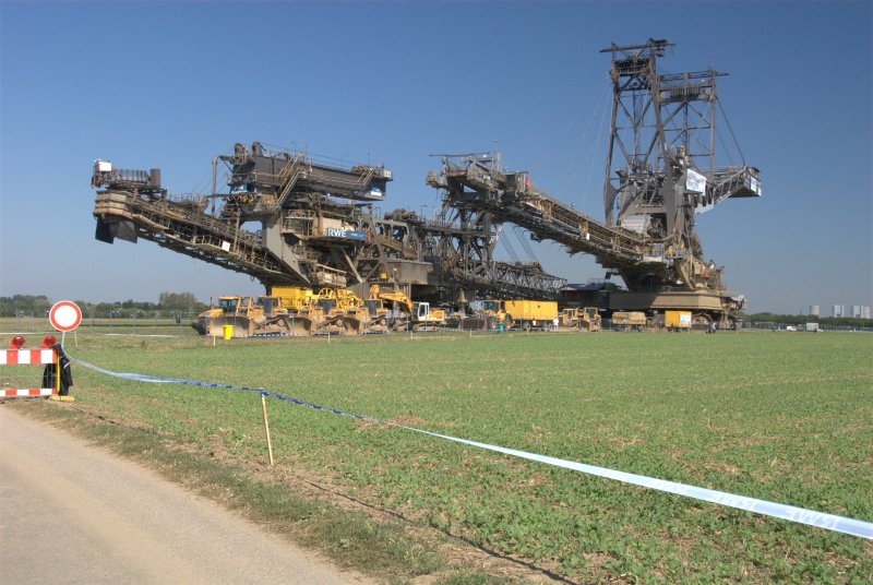 Ein Koloss auf Reisen. Absetzer 756 zusammen mit seinen ständigen Begleiter Bandschleifwagen 946 (Hersteller Demag/Lauchhammer Bauj.1977)von RWE-Power warten am 24.08.2009 in der Nähe der A61 bei Bergheim auf weiterfahrt zum Braunkohletagebau Hambach. (Überquert die A61 an späten Abend des 29.08.2009)
