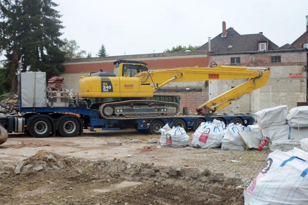 PC 240 NCL-Bagger von der Firma Koch, auf einen Tieflader in Lehrte/Ahltnerstraße, am 23.Juli 2010