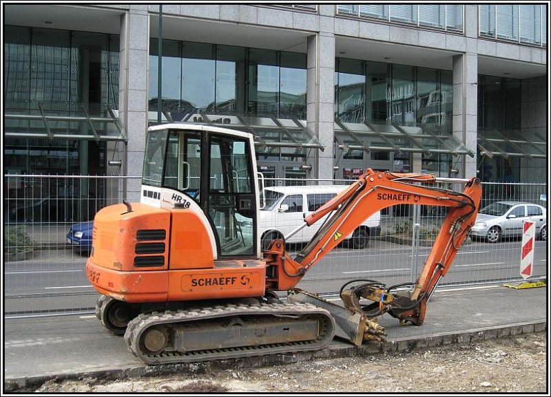 Ein kleiner Bagger des Herstellers Schaeff im Einsatz auf der Elisabethstraße in Düsseldorf auf Höhe des Kirchplatzes. Hier wird eine der unterirdischen Haltestellen für die neue U-Bahn-Linie "Wehrhahnlinie" gebaut. Ganz so weit ist es am Aufnahmetag 15.03.2008 aber noch nicht; zunächst stehen vorbereitende Arbeiten wie Verlegen von Versorgungsleitungen und Versetzen von Straßenbahngleisen auf dem Programm.