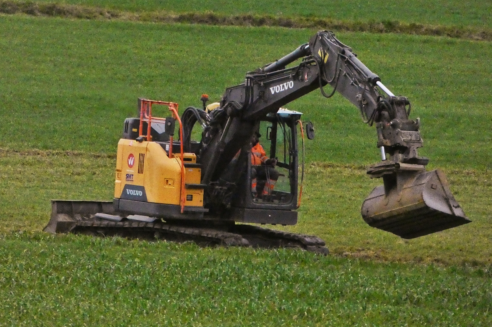 Düsseldorf, U-Bahn-Projekt Wehrhahnlinie, Startschacht und Rampe Bilk, 13.05.2009: Ein Volvo-Bagger baggert in der gewaltigen Grube, in der in einigen Monaten die Tunnelvortriebsmaschine zusammengebaut werden soll, die den Tunnel der U-Bahn-Strecke bauen soll.