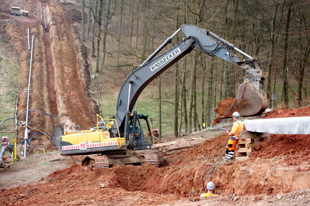 Volvo der Firma "KASSECKER" beim Grabenaushub für die Laugenleitung der K&S in der Gemarkung 36100 Petersberg-Marbach im April 2013