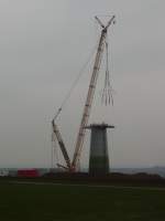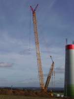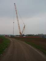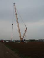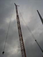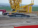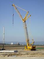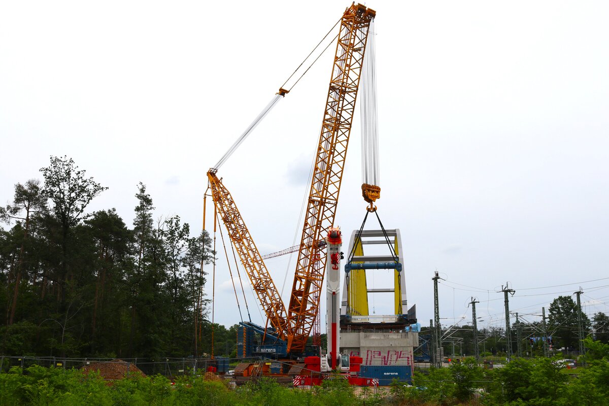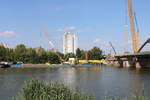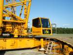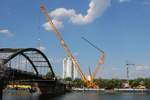 Wiesbauer TEREX Rauppenkran am 30.07.19 in Stockstadt am Main auf einer Brückenbaustelle von Ufer aus fotografiert