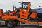Bomag Tandemwalze Asphalt Manager 2, wird gut befestigt auf einem Tieflader transporiert. 10.2023