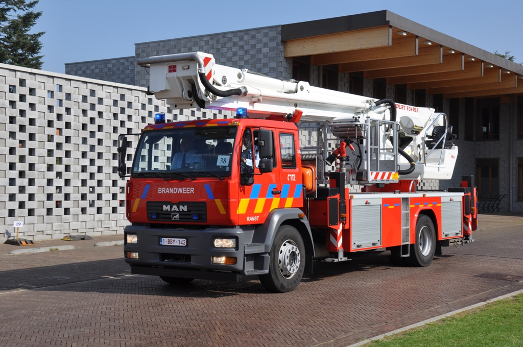Gelenkmastbühne MAN 18.280 Aufbau Bronto Skylift Typ F34 RLX der Feuerwehr Ranst, ehemaliges Fahrzeug der BF Brussel, Aufnahme am 25.09.2011 in Schoten aus Anlass der Umzug für 100 Jahr-Feier "brandweer Schoten"