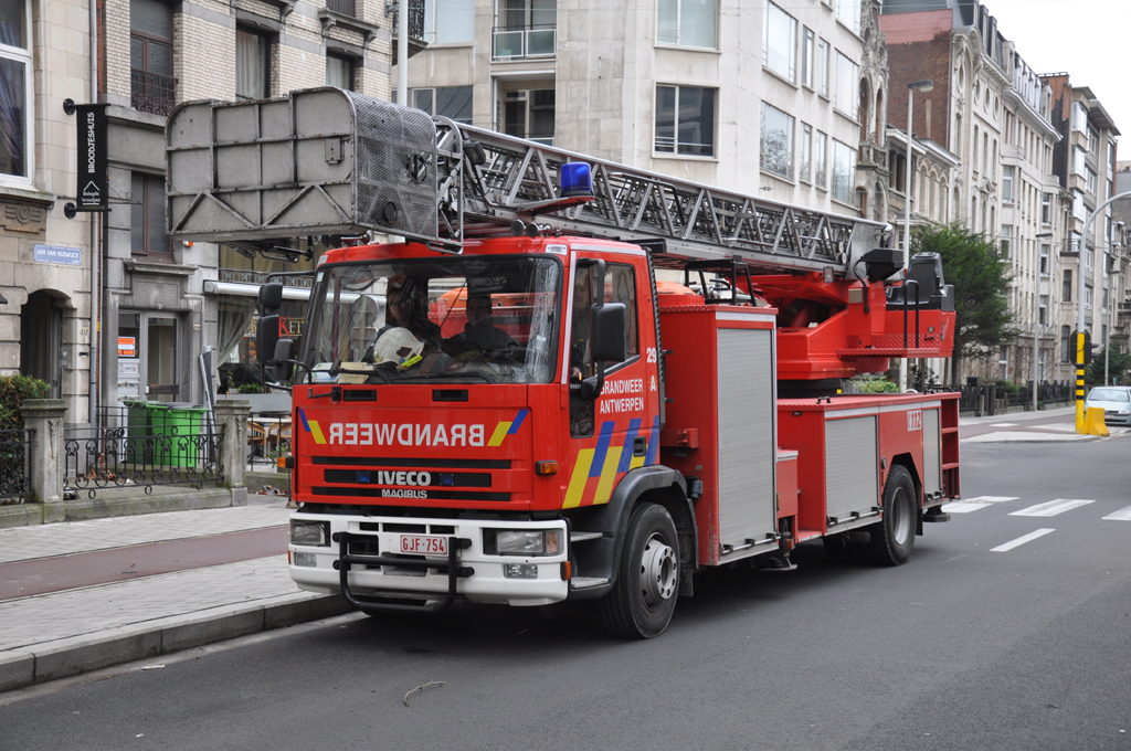 Drehleiter Iveco 150E27 Aufbau Magirus DLK 23-12 der BF Antwerpen, Reservefahrzeug, Aufnahme am 06.01.2012