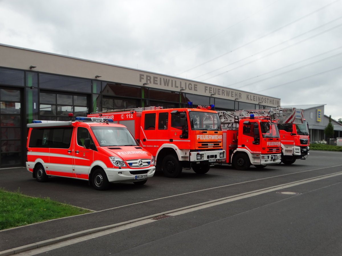 Löschzug Feuerwehr Kleinostheim mit Mercedes Benz Sprinter ELW (Florian Kleinostheim 12/1), IVECO/Magirus TLF 16/25 (Florian Kleinostheim 20/1), IVECO/Magirus DLK 23/12 (Florian Kleinostheim 30/1 ) und dem neuen MAN TGM HLF20 (Florian Kleinostheim 40/1) bei einen Fototermin am 12.08.17.