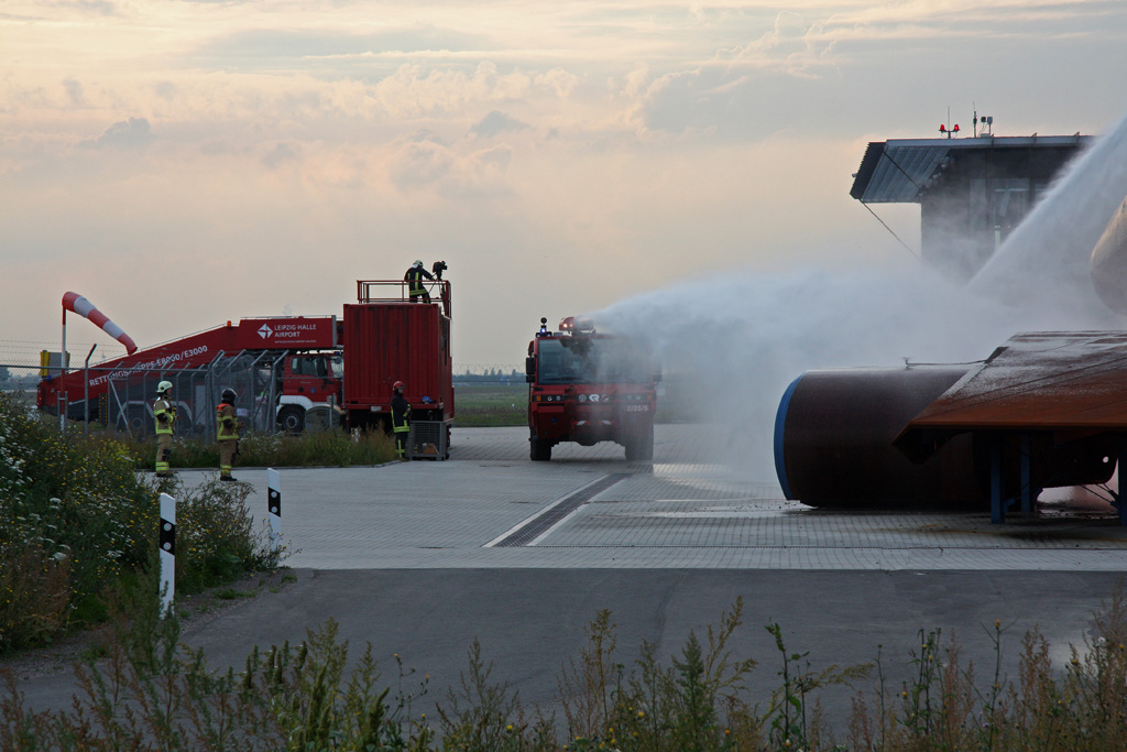 Ein Panther FLF 14000/1000 der Leipziger Flughafenfeuerwehr beim Löschangriff auf ein "brennendes Flugzeug". Zum Glück nur eine Übung auf dem Gelände des "Fire Training Center" am Flughafen Leipzig/Halle am 24.09.2010.