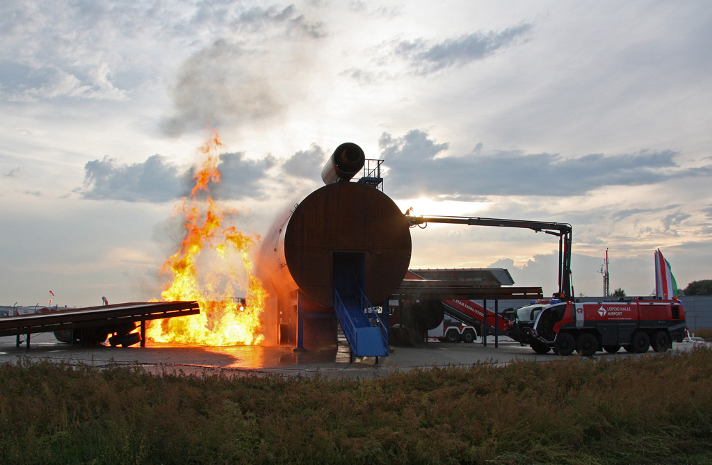Der nagelneue Panther 8x8 MA-5 HRET mit seinem 15m hohen Gelenkarm mit Löschlanze und Infrarotkamera beim Löschangriff auf die gasbefeuerte Boeing 747-Simulationsanlage während einer Übung am 24.09.2010 auf dem Flughafen Leipzig/Halle.
