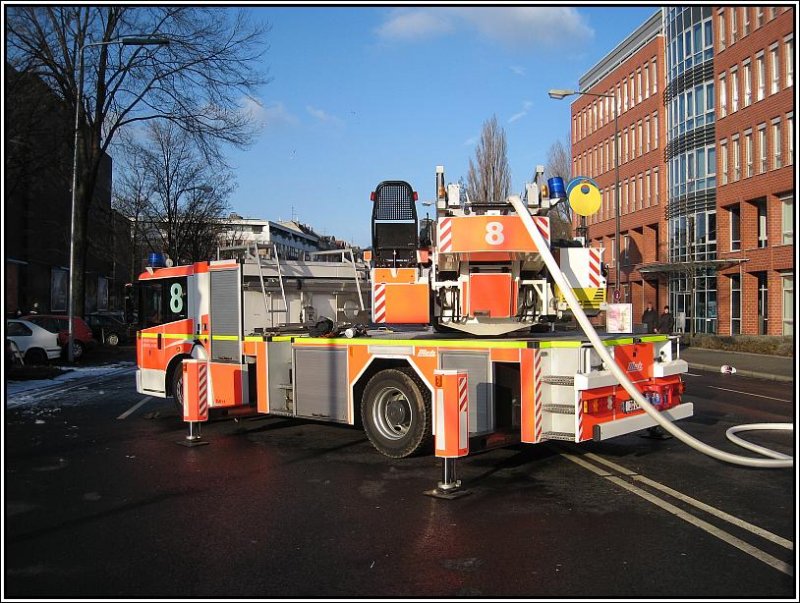 In der letzten Silvesternacht brannte im Düsseldorfer Stadtteil Bilk das Lager einer Papierfabrik nieder. Am frühen Nachmittag des 01.01.2008 war das Feuer längst erloschen, trotzdem standen noch zahlreiche Fahrzeuge der Düsseldorfer Feuerwehr am Brandort, auch dieser Leiterwagen.