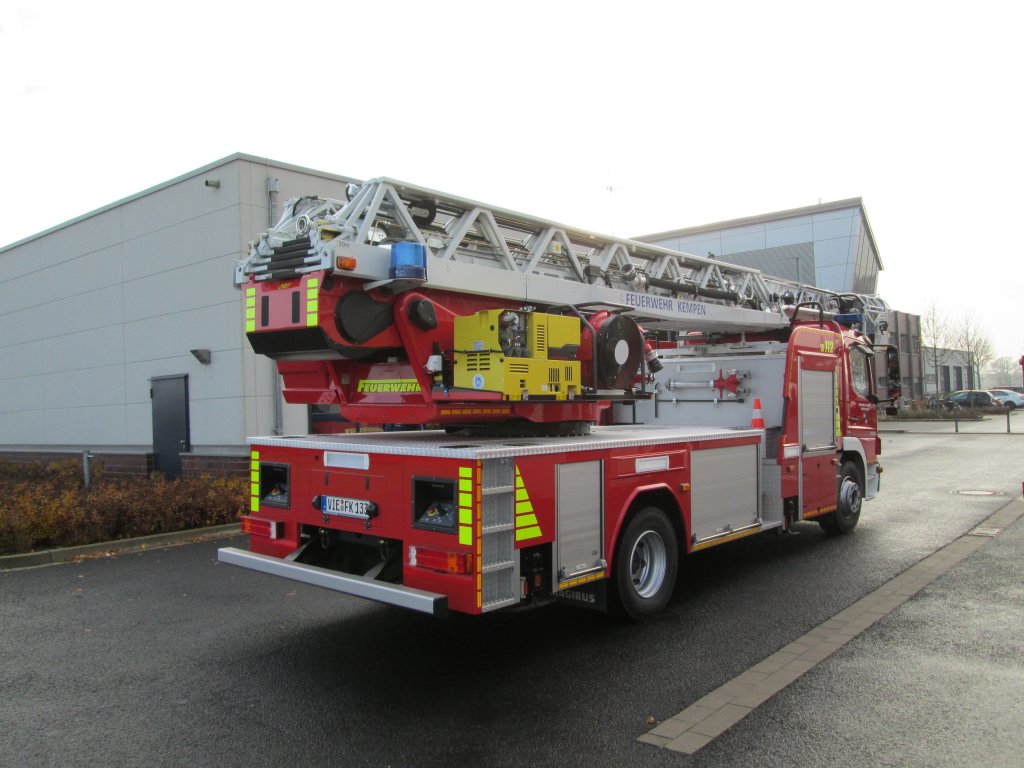 Die neue Drehleiter mit Korb DLK (A) 23-12 (M 32 L-AT) der Freiwilligen Feuerwehr Kempen, Löschzug Kempen. Fahrgestell: Mercedes Benz Atego 1529 F Aufbau: Magirus Abstützung: Magirus-Vario-Abstützung Magirus Abstützsicherheitssystem mit Bodendrucküberwachung Abstützbreite: 2.400 mm bis 4.500 mm Variable Abstützbreite, jede Stütze einzeln steuerbar Leiterstuhl und Leitersatz: Leiterstuhl mit Niveauregulierung bis zu 10° Leitersatz mit Arbeitsbereich von -17° bis +75° Hauptbedienstand Lagerung für Wenderohr, Stromerzeuger und Lüfter auf der rechten Seite Leitersatz 4-teilig, 32 m, Auszug über Seilwinde bis zu 75° Grad abknickbares, 4.700 mm langes, vorderes Leiterteil Wasserversorgung im obersten Leiterteil bis zum Korb Ausstattung u.a.: Stromerzeuger Druckbelüfter Die DLK ist am 19.11.2012 bei einem Foto Termin in Kempen von mir aufgenommen worden