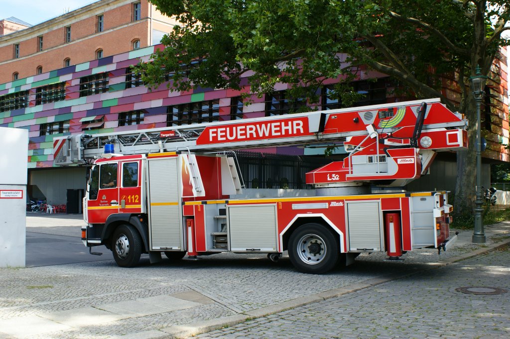 MAN 14.225 LC Drehleiter mit Korb (DLK) 23/12 bei Einfahrt in die Berliner Feuerwache Tiergarten (1700). Aufgenommen am 31.07.2012.