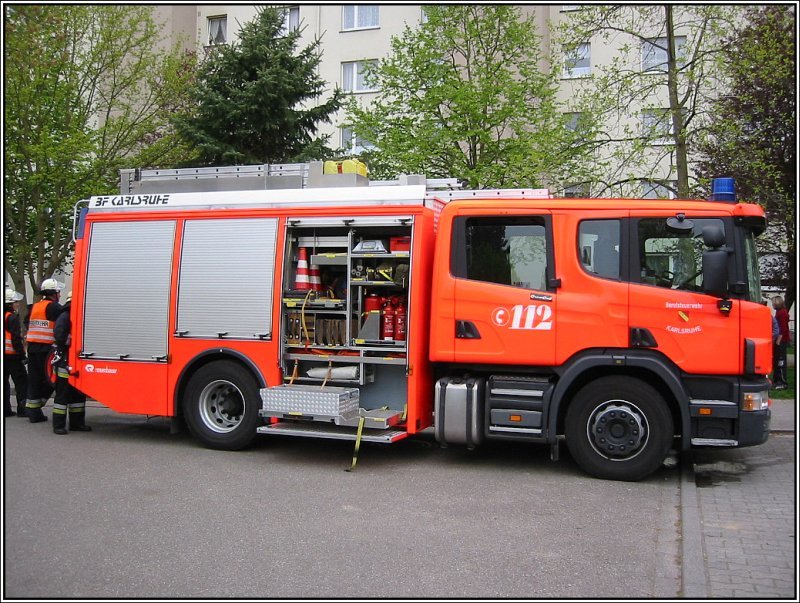 Einsatz im Karlsruher Stadtteil Oberreut am 17.04.2004. Im Bild ein Löschfahrzeug der Berufsfeuerwehr Karlsruhe.