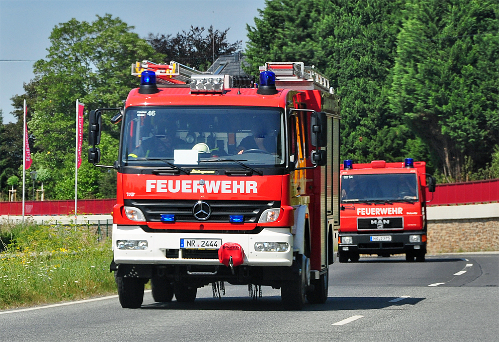 MB Atego LF und im Hintergrund Rüstwagen der Feuerwehr bei Unkel - 15.08.2012