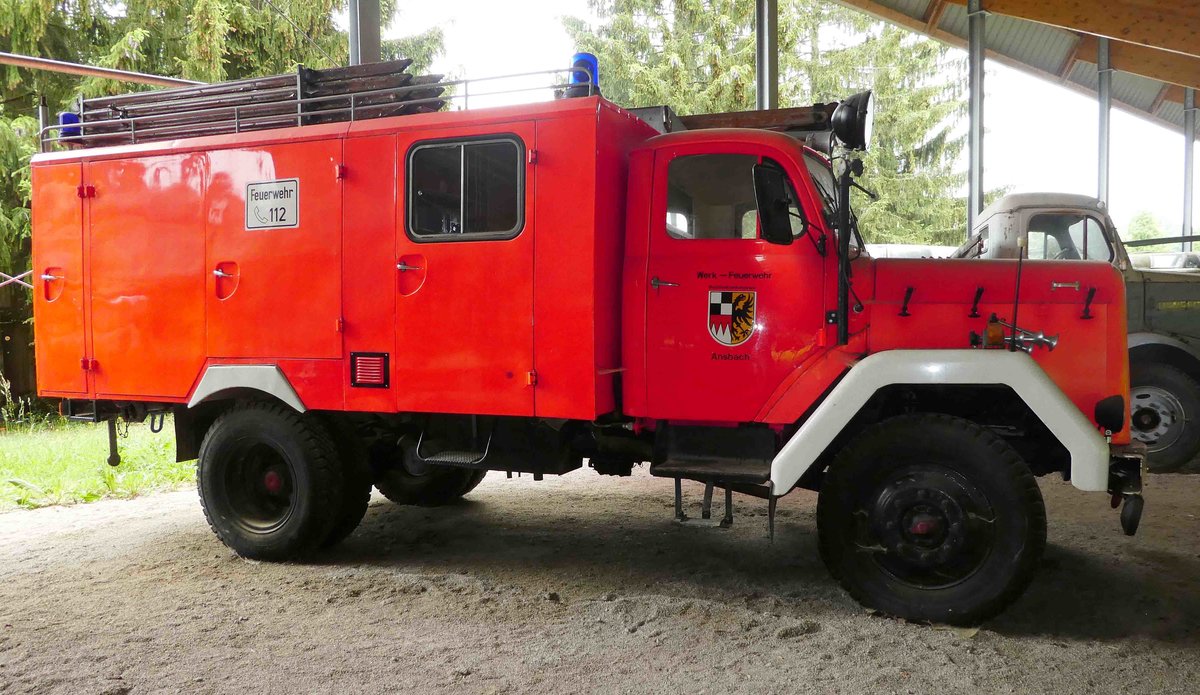 =Magirus als ehem. Werk-Feuerwehrfahrzeug des Bezirkskrankenhauses Ansbach, gesehen im Deutschen Automobilmuseum Fichtelberg im Juli 2018