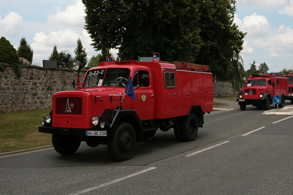 Magirus Deutz Löschfahrzeug am 04.07.21 bei einer Oldtimer Parade zum Jubiläum 75 Jahre Kreisfeuerwehrverband Gießen in Lich (Hessen)