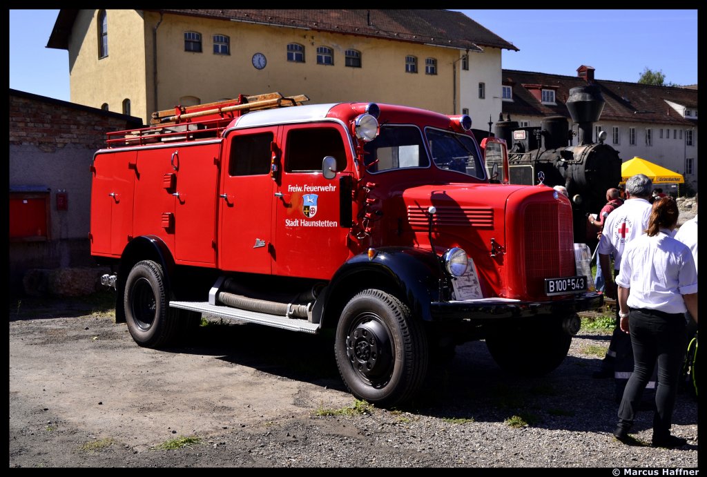 Ein altes Feuerwehrfahrzeug der freiwilligen Feuerwehr Stadt Haunstetten des Herstellers Mercedes beim 30 Jährigen Jubiläum der IGE Bahntouristik. Gesehen am 9. September 2012 im Bahnpark Augsburg.