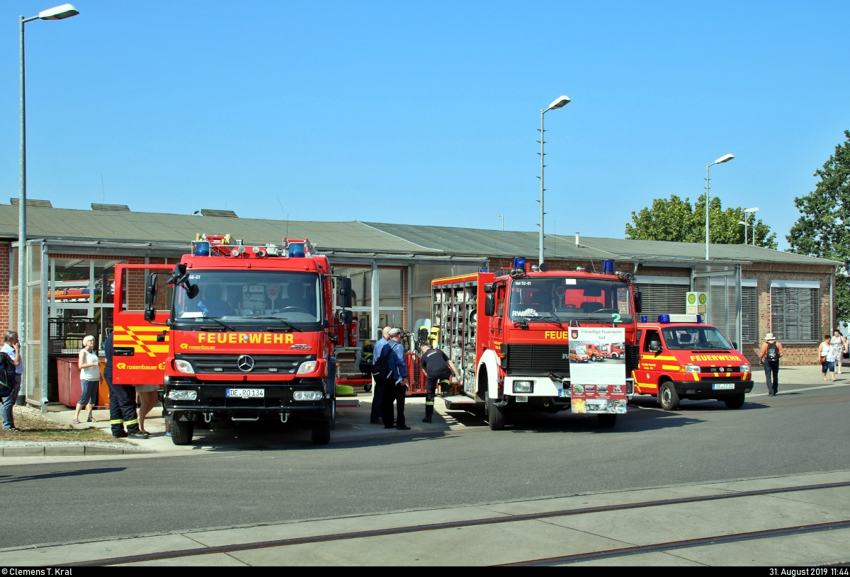 Hilfeleistungslöschfahrzeug (HLF 20/16) Mercedes-Benz Atego 1529 AF (DE-RO 134), Rüstwagen (RW 2) Iveco 120-25 AW (DE-ZZ 10) und Mannschaftstransportwagen (MTW) VW T4 (DE-ZZ 21) der Freiwilligen Feuerwehr Dessau-Süd stehen anlässlich des Tags der offenen Tür im DB Werk Dessau (DB Fahrzeuginstandhaltung GmbH).