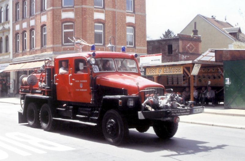 Mercedes Benz 1222 HLF aus dem Jahr 1993. Der Motor des MB 1222 ist der kleinste, von den großen Dieselmotoren dieser Fahrzeuggeneration, unter dem Standardfahrerhaus der so genannten  Neuen Generation  NG80. Der gezeigte 1222 erhielt seinen Aufbau von der Firma Ziegler und wurde danach an die Berufsfeuerwehr Leipzig ausgeliefert. Im Jahr 2009 wurde er dort ausgemustert und an eine FF im Kreis Leipzig weiter gegeben. Feuerwehrtechnisch ist dieses Fahrzeug heute noch mit einem Löschwassertank mit einem Volumen von 1600 Litern, einem hydraulischen Rettungssatz, einem Stromerzeuger, einem Lichtmast mit zwei mal 1000 Watt, einem Überdrucklüfter, diversem Verkehrssicherungsmaterial, einer Kettensäge, Tauchpumpen und einem Hebekissen ausgestattet. Der V6-Motor vom Typ OM421 hat einen Hubraum von 10.965 cm³ und leistet 216 PS. Die technischen Daten des OM 421 mit 11 Litern Hubraum, aber nur 216 PS sagen eigentlich alles. Das Ding lebt ewig. Treffen für Feuerwehr-Oldtimer am 14.09.2024 an der  Alten Dreherei  in Mülheim an der Ruhr.
