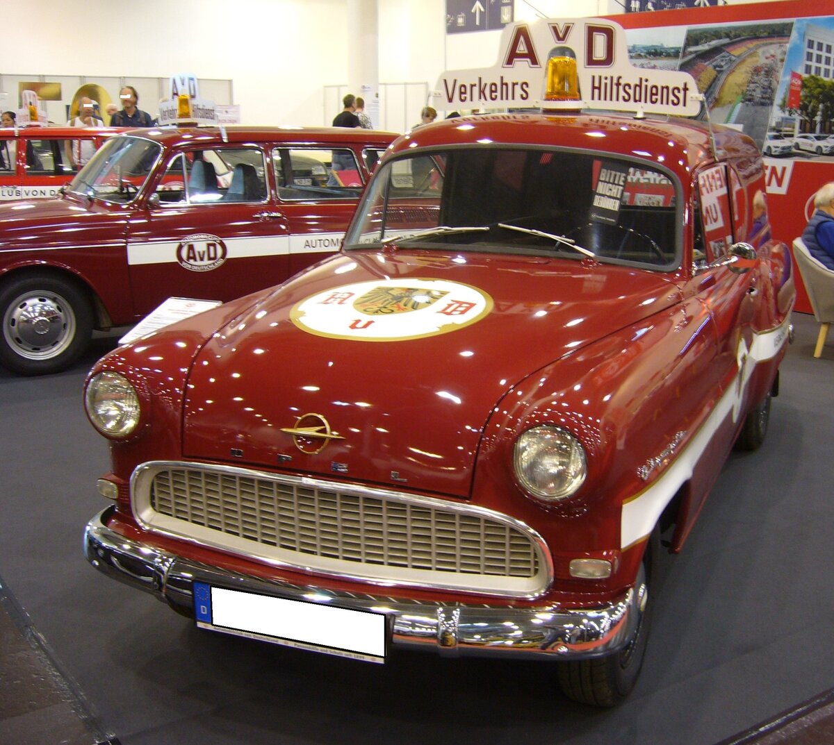 Heckansicht eines Opel Olympia Rekord Kasten-Lieferwagen aus dem Jahr 1956 als Pannendienstfahrzeug des AvD. Essen Motor Show am 28.11.2025.