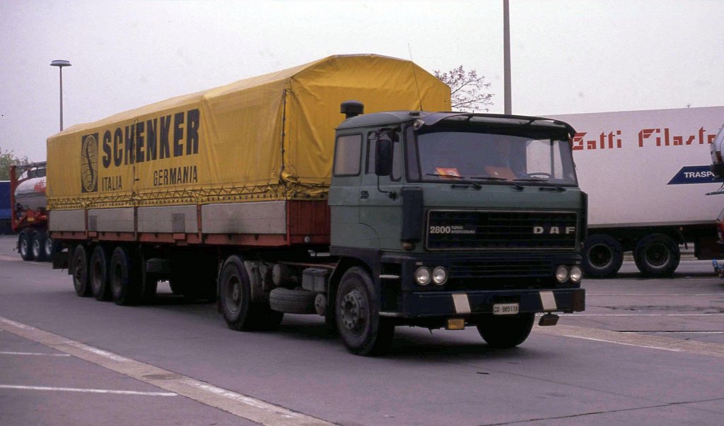 DAF 2800 mit Schenker Sattelauflieger am 29.3.1990 in Bruchsal.