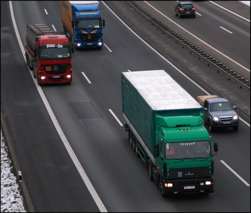 Ein MAZ aus Weißrussland ist bei Lüdenscheid in Richtung Süden unterwegs. (11.12.2008)