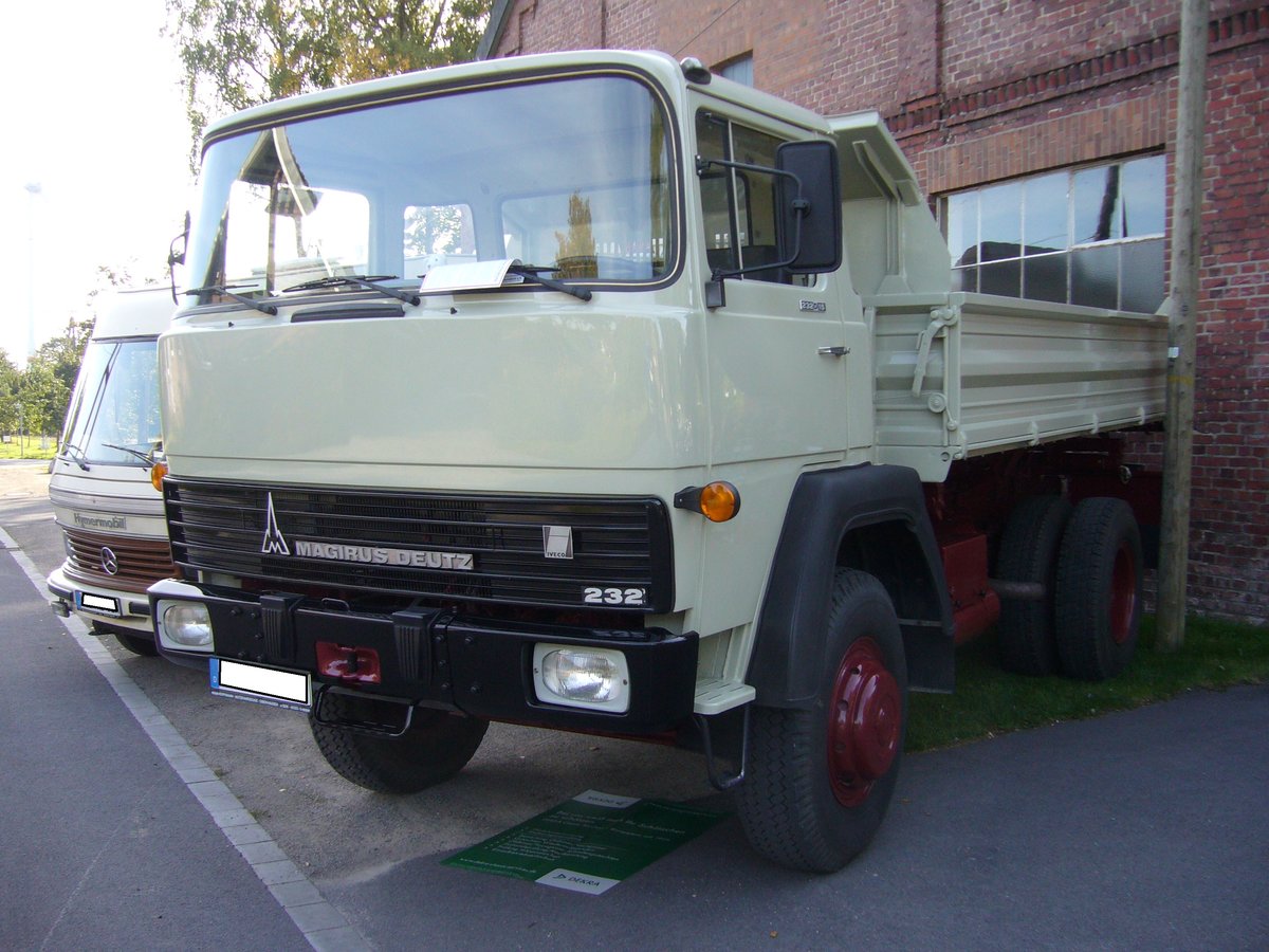 Magirus Deutz 232D15 Kipplastwagen. Angetrieben wird der Kipper von einem luftgekühlten V8-Dieselmotor, der aus einem Hubraum von 11200 cm³ 232 PS leistet. Oldtimertreffen des Oldtimerclubs Schermbeck am 22.09.2019 in Lühlerheim.