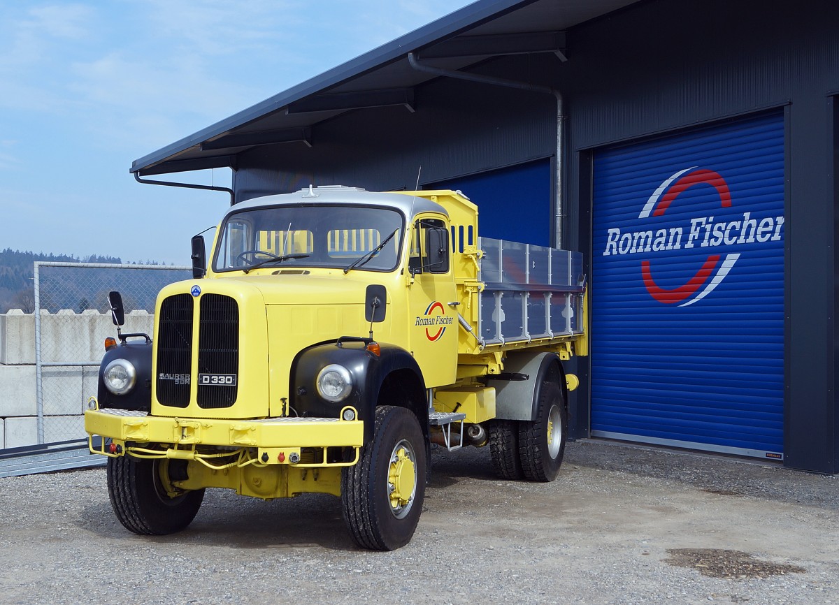 SAURER: Der sehr schön renovierte SAURER 5 DM D 330 Kipper wurde am 16. März 2015 bei Roggwil im Bilde festgehalten.