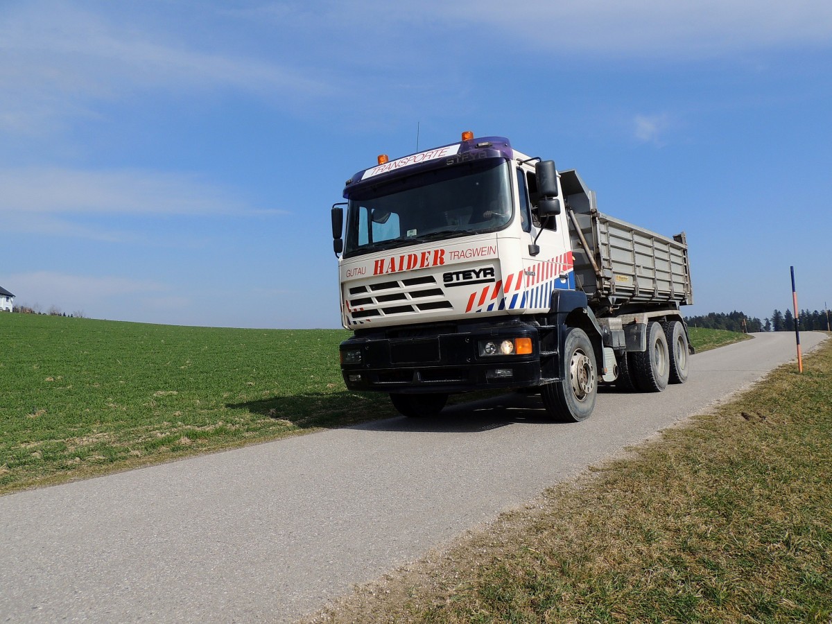 STEYR 33S41 mit Kipperaufbau, auf einem abschüssigen Güterweg zugegen; 150324