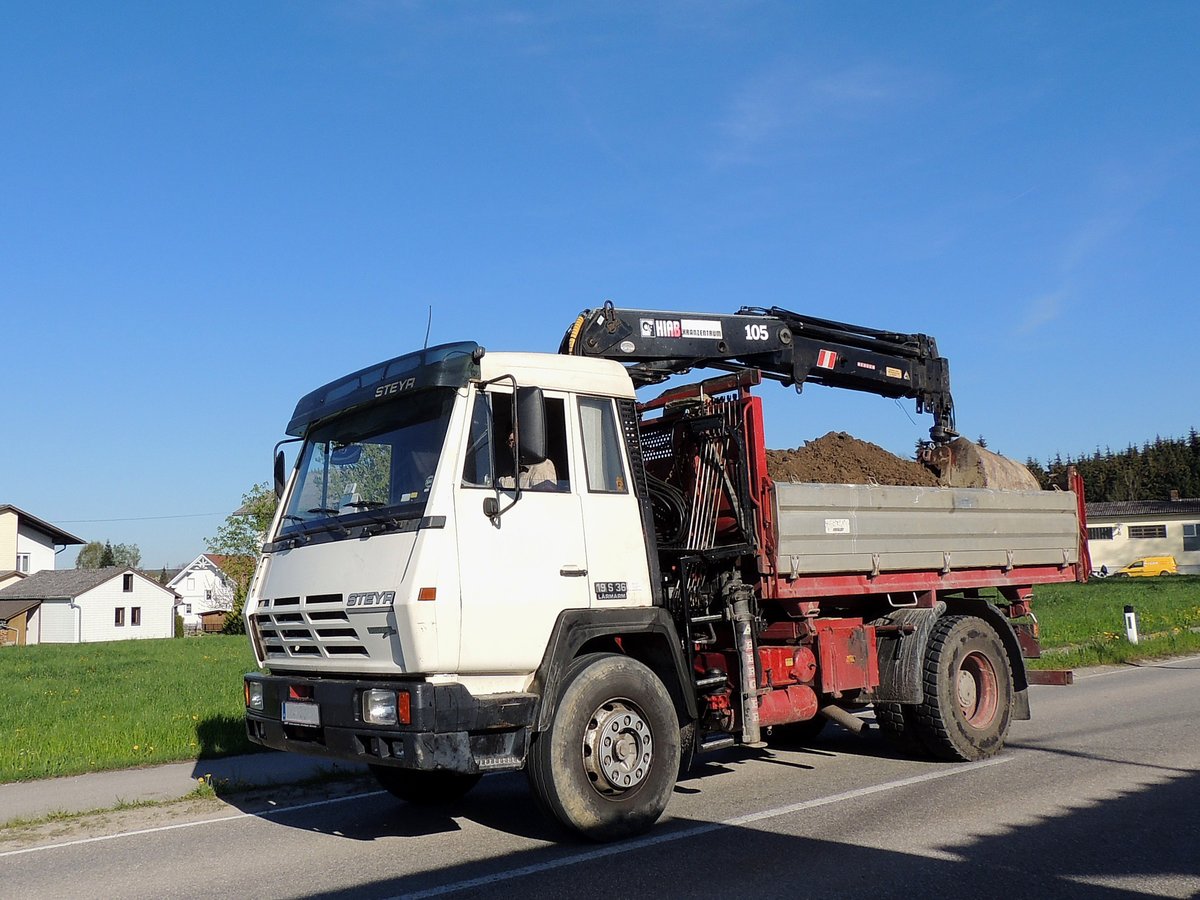 STEYR 16S36 transportiert eine Fuhre Erde, welche zuvor mit der HIAB-Kranschaufel aufgeladen wurde; 160421
