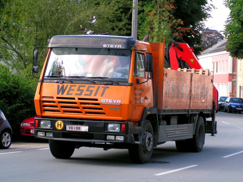 STEYR eines Baustoffbetriebes kehrt mit Leerpaletten zur Betriebstätte zurück; 080804