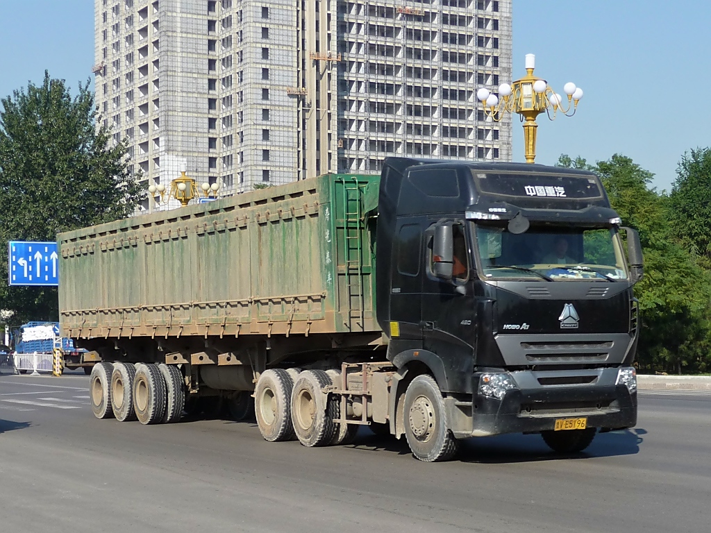 CNHTC HOWO A7 Kipplastzug an der Kreuzung South- und East-Ring-Road in Shouguang, 16.10.11