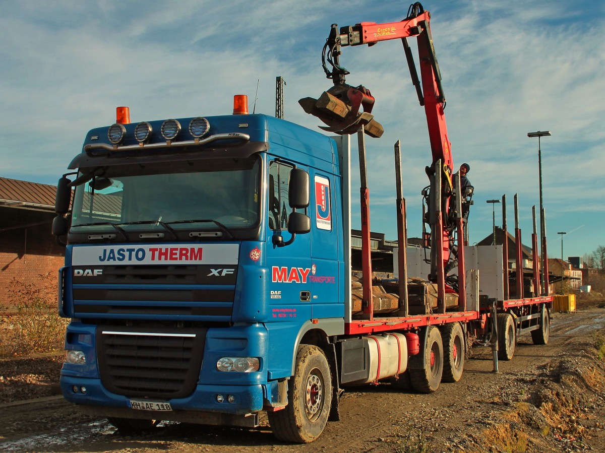 Ein DAF 105.460 Hängerzug läd am 16.12.2013 mit seinem Ladekran (Palfinger E165Z Plus) alte Betonschwellen in Aachen West.