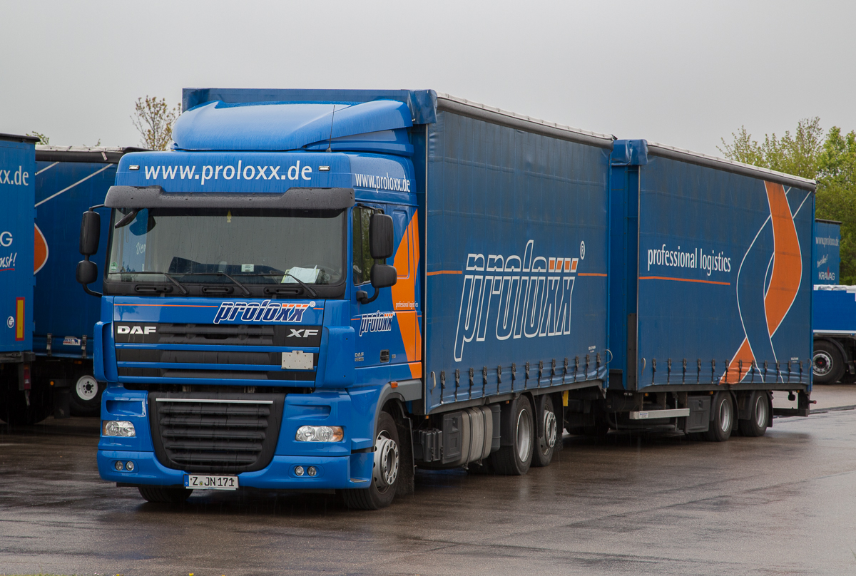 DAF XF 105.460 Tandem-Hängerzug von proloxx wartet auf dem Betriebshof bei Ansbach auf den nächsten Einsatz, 18.04.2014 (Bild wurde von einer öffentlichen Straße aus aufgenommen)