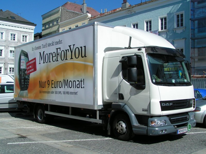 DAF_LF45.220 steht anlässlich der Österreichtour des Mobilfunkbetreibers "DREI" am Hauptplatz in Ried i.I.; 090617