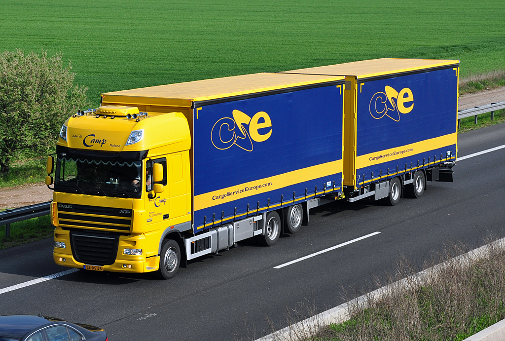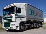DAF FAR XF 105 (genaue Bezeichnung im Niederländischen Kfz-Register), Tandemzug "Van de Camp", auf der A61 bei Miel - 28.04.2011